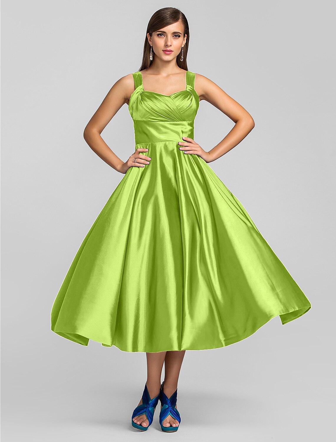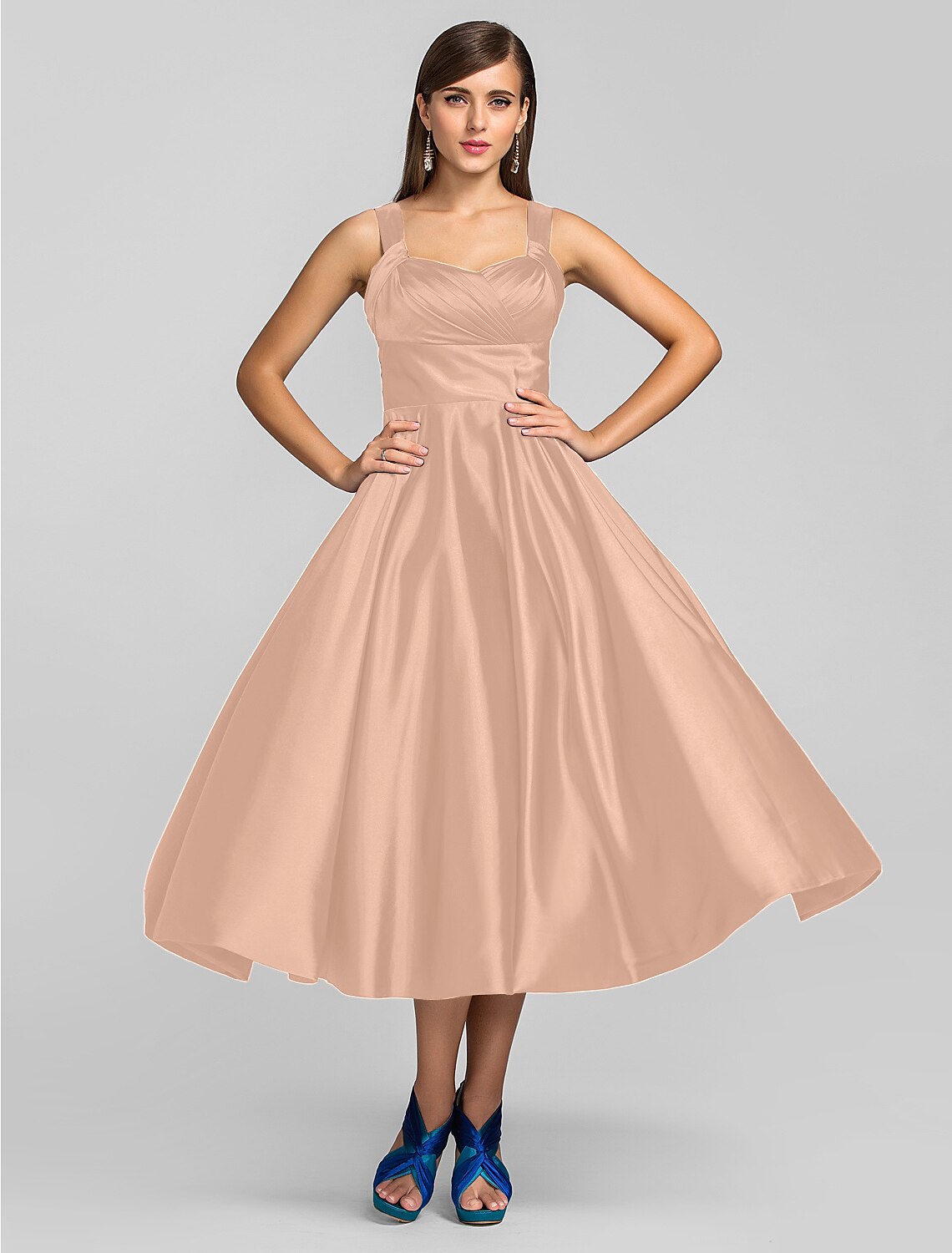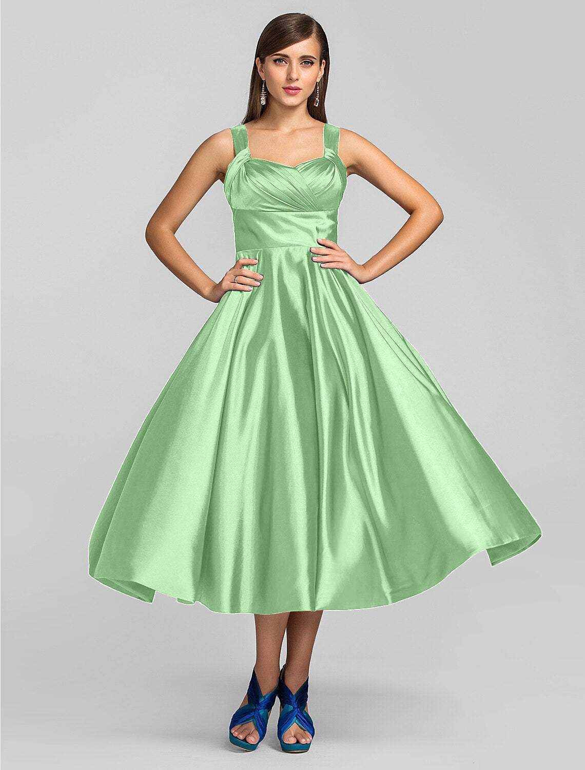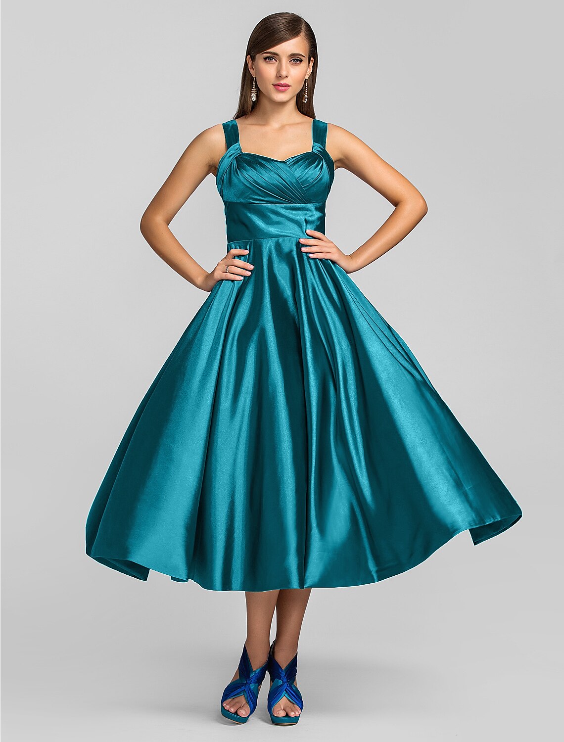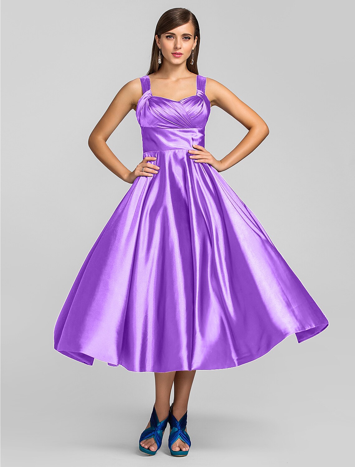Wholesale A-Line Minimalist Dress Wedding Guest Tea Length Sleeveless Square Neck Stretch Satin - Royal Blue