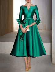 Wholesale A-Line Cocktail Dresses Christmas Red Green Dress Wedding Guest Tea Length 3/4 Length Sleeve V Neck Satin with Bow(s) Appliques - Dark Green / US 2 / UK 6 / EU 32