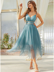 Wholesale A-Line Flirty Cute Cocktail Party Dress V Neck Sleeveless Asymmetrical Tulle with Pearls