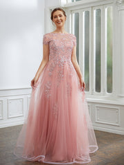 Wholesale A-Line/Princess Tulle Applique Bateau Short Sleeves Floor-Length Dresses