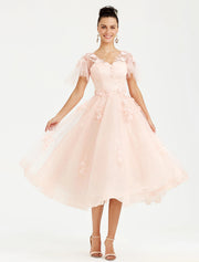 Wholesale A-Line Prom Dresses Elegant Dress Wedding Guest Cocktail Party Tea Length Short Sleeve V Neck Tulle with Appliques - US 2 / UK 6 / EU 32