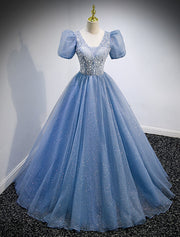 Wholesale A-Line Prom Dresses Puffy Dress Quinceanera Prom Floor Length Short Sleeve V Neck Tulle with Sequin - US 2 / UK 6 / EU 32