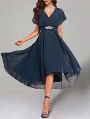 Wholesale A-Line Wedding Guest Dresses Elegant Dress Cocktail Party Semi Formal Tea Length Short Sleeve V Neck Belt / Sash Chiffon with Beading - US 2 / UK 6 / EU 32