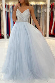 Wholesale Blue V-Neck Tulle Long Prom Dress A-Line Spaghetti Straps Evening Party Dress
