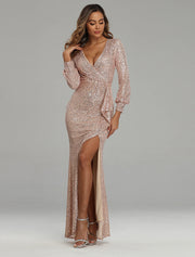 Wholesale Mermaid / Trumpet Evening Gown Sparkle Dress Party Wear Wedding Guest Floor Length Long Sleeve V Neck Sequined with Sequin