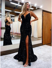 Wholesale Mermaid / Trumpet Prom Dresses Sparkle & Shine Dress Formal Wedding Party Court Train Sleeveless V Neck Sequined Backless with Sequin Slit - Black / US 2 / UK 6 / EU 32