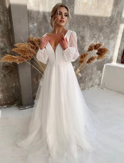 Wholesale Reception Casual Fall Wedding Dresses A-Line V Neck Long Sleeve Floor Length Tulle Bridal Gowns