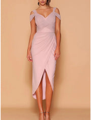 Wholesale A-Line Bridesmaid Dress V Neck Short Sleeve Elegant Tea Length Chiffon with Split Front / Ruching - US 2 / UK 6 / EU 32