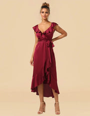 Wholesale Asymmetrical Burgundy V-Neck Satin Bridesmaid Dress With Ruffle Bridesmaid dress shop - US 2 / UK 6 / EU 32