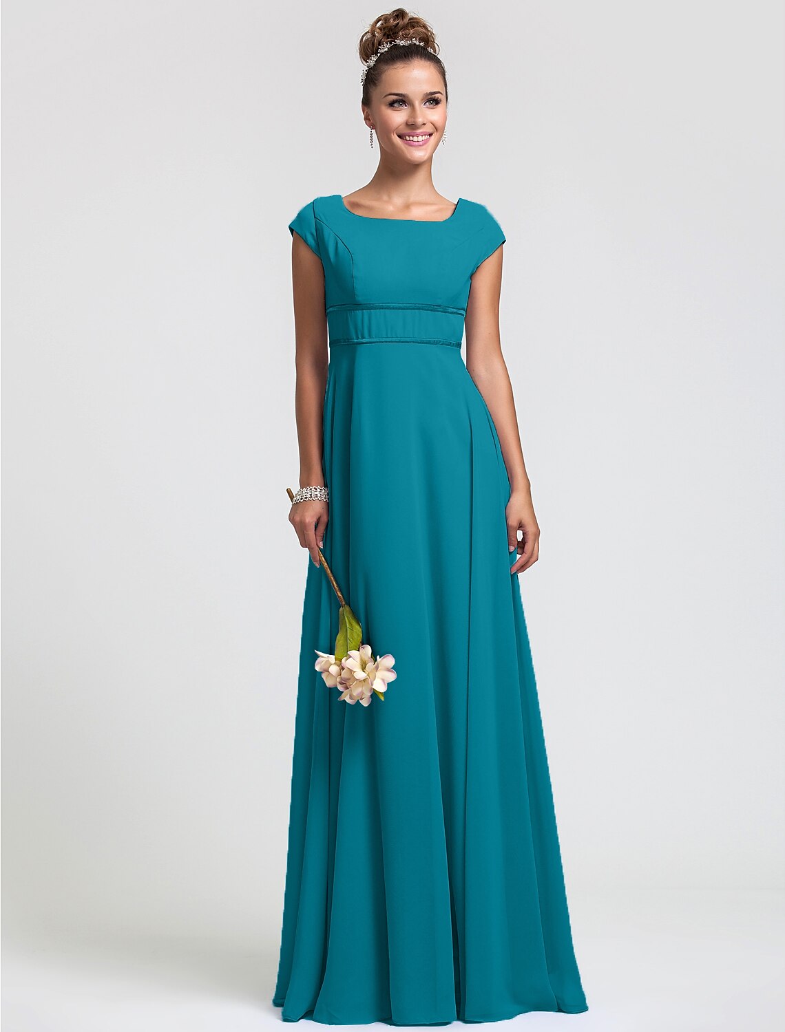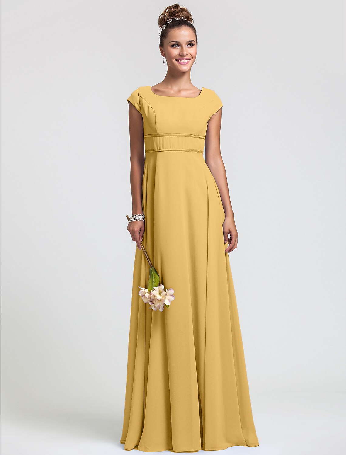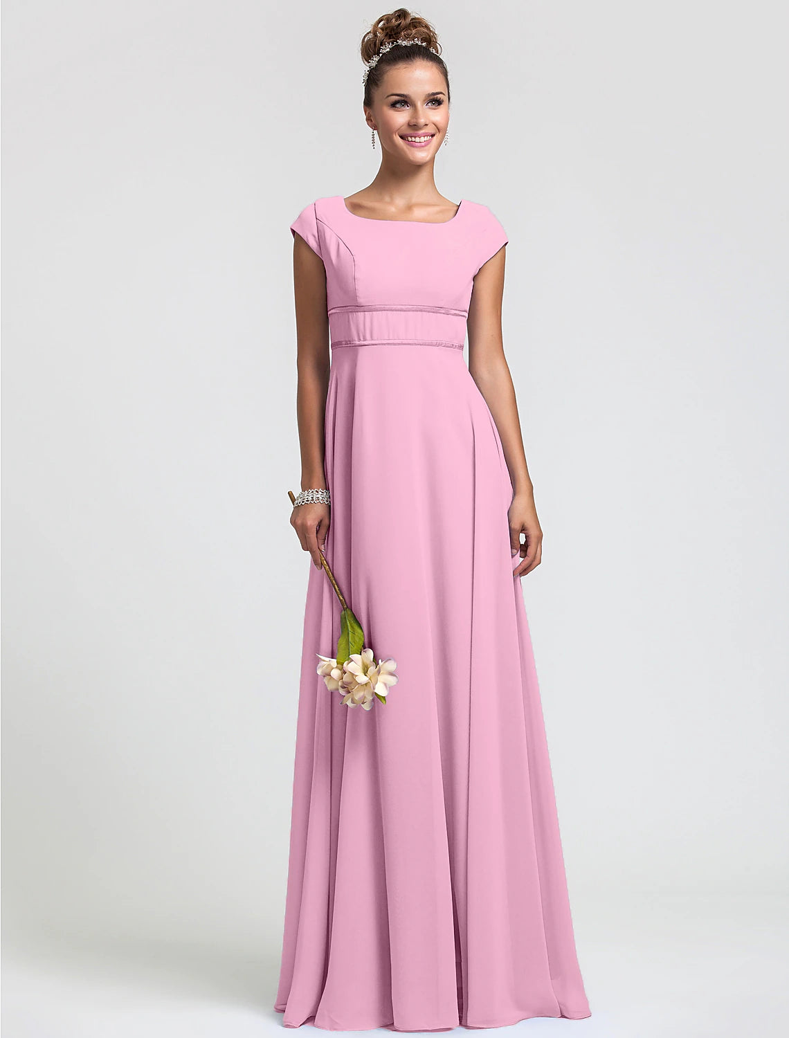 Wholesale Sheath / Column Bridesmaid Dress Square Neck Short Sleeve Elegant Floor Length Chiffon with Sash / Ribbon / Pleats