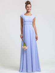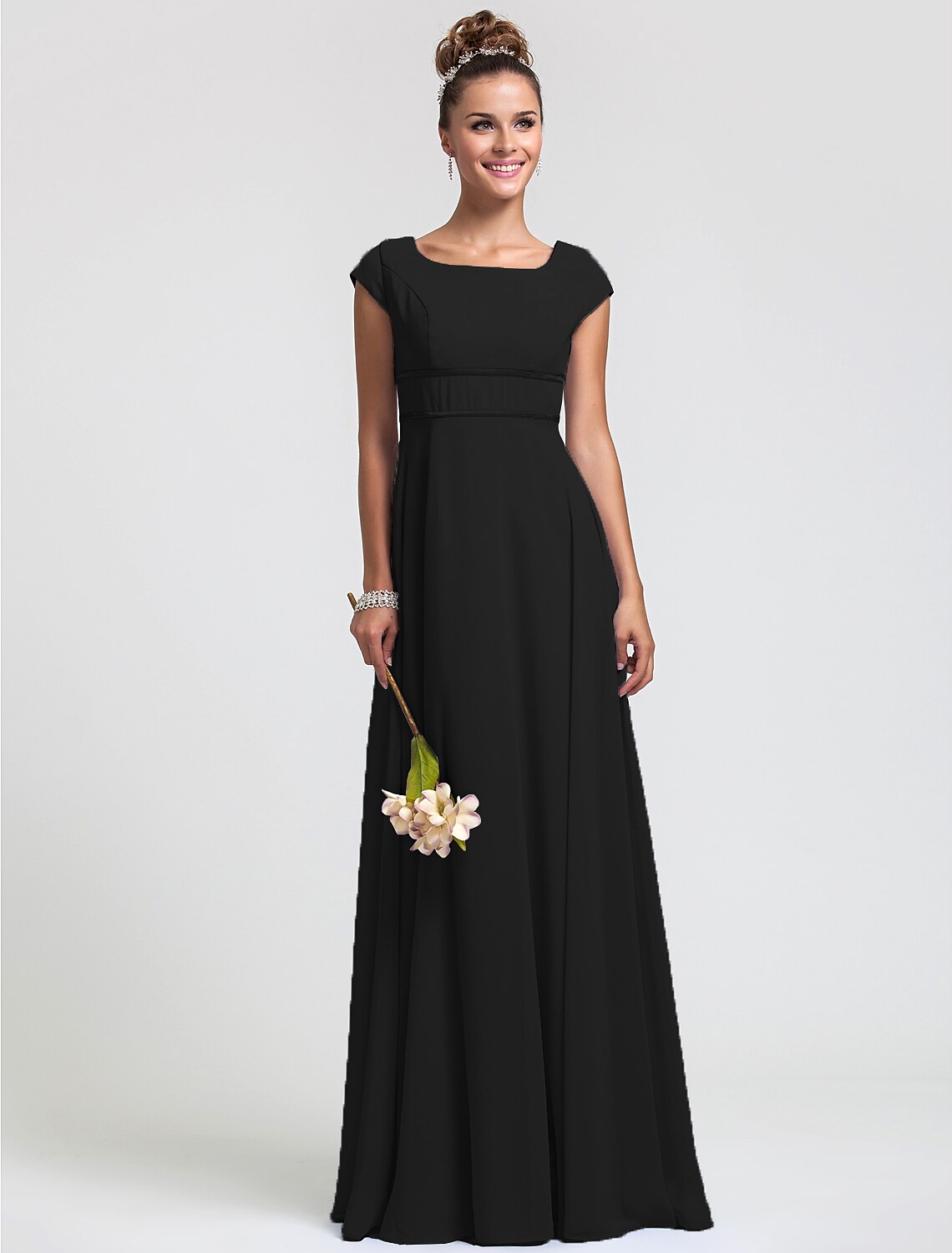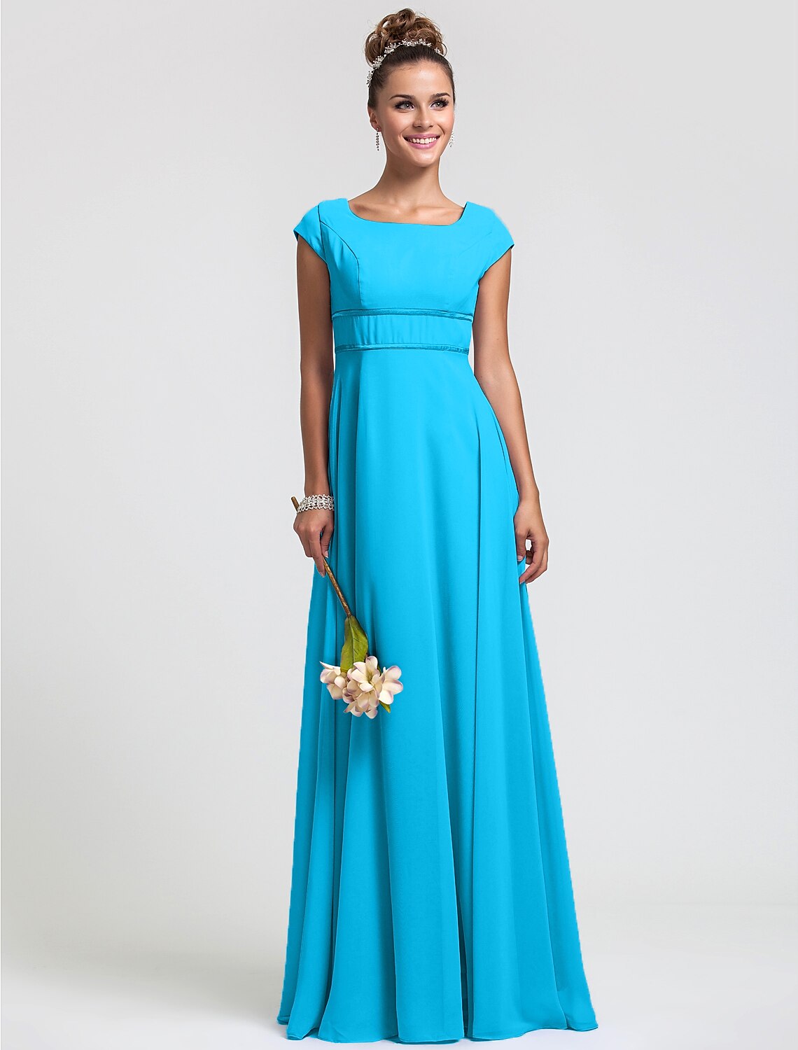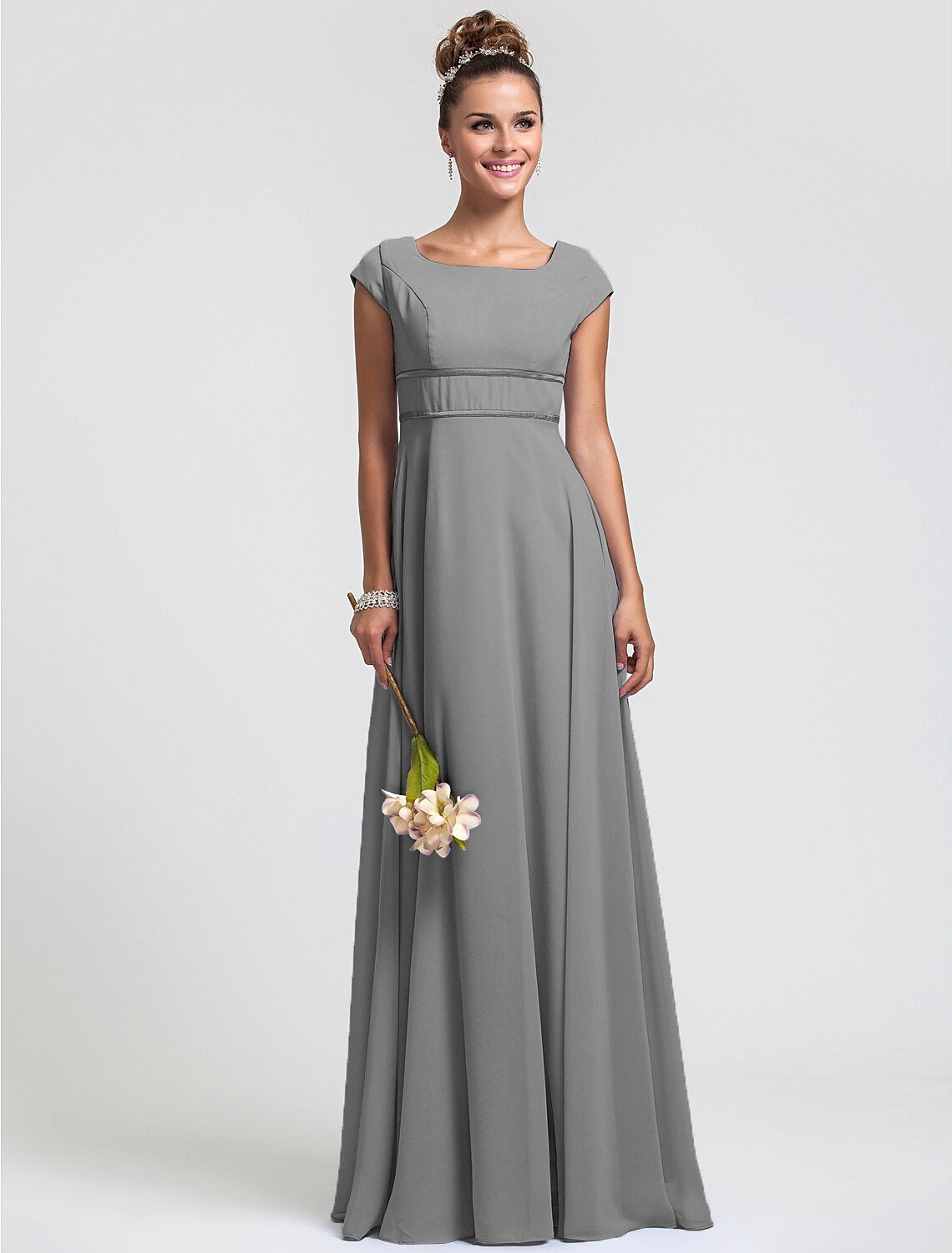Wholesale Sheath / Column Bridesmaid Dress Square Neck Short Sleeve Elegant Floor Length Chiffon with Sash / Ribbon / Pleats