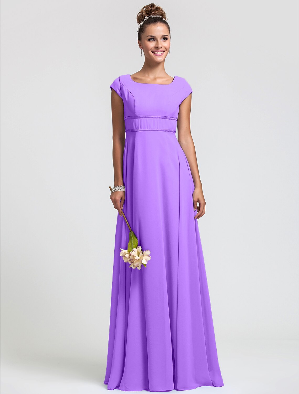 Wholesale Sheath / Column Bridesmaid Dress Square Neck Short Sleeve Elegant Floor Length Chiffon with Sash / Ribbon / Pleats - Lavender