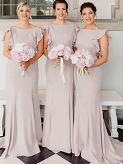 Wholesale Sheath/Column Stretch Crepe Ruched Bateau Sleeveless Court Train Bridesmaid Dresses
