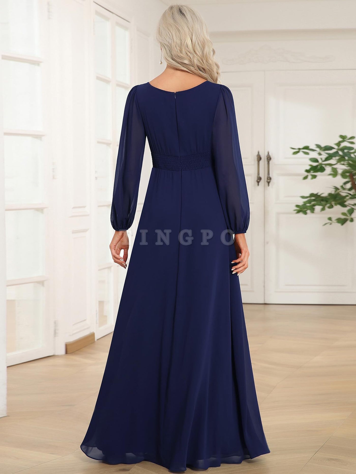 Wholesale Women's Crewneck Lantern Sleeves A-Line Pleated Chiffon Maxi Formal Dress prom dress shop