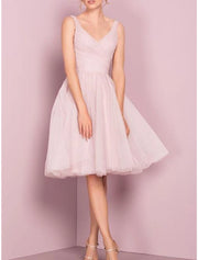 Wholesale A-Line Cocktail Dresses Flirty Dress Homecoming Graduation Knee Length Sleeveless V Neck Pink Dress Tulle with Pleats - US 2 / UK 6 / EU 32