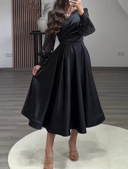 Wholesale A-Line Cocktail Dresses Sparkle Black Dress Wedding Party Wear Tea Length Long Sleeve V Neck Charmeuse with Ruched Pearls Sequin - US 2 / UK 6 / EU 32