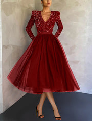 Wholesale Ball Gown A-Line Cocktail Dress Christmas Red Green Dresses Vintage Dress Evening Party Cocktail Party Tea Length Long Sleeve Jewel Neck Fall Wedding Guest Tulle with Sequin - Burgundy / US 2 / UK 6 / EU 32