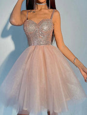 Wholesale Ball Gown A-Line Sparkle & Shine Puffy Cocktail Party Prom Dress Spaghetti Strap Short Sleeve Knee Length Tulle with Sequin Tier