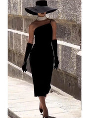 Wholesale Sheath / Column Cocktail Black Dress Vintage Dress Halloween Party Wear Tea Length Sleeveless One Shoulder Stretch Fabric with Strappy - US 2 / UK 6 / EU 32
