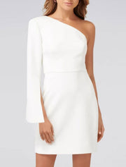Wholesale Sheath / Column Minimalist White Wedding Guest Cocktail Party Birthday Dress One Shoulder Long Sleeve Short / Mini Satin with Draping - US 2 / UK 6 / EU 32