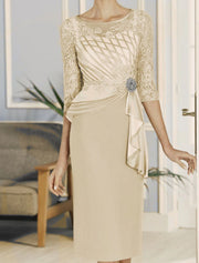 Wholesale Sheath / Column Mother of the Bride Dress Elegant Jewel Neck Knee Length Satin Lace 3/4 Length Sleeve with Ruffles Embroidery - US 2 / UK 6 / EU 32
