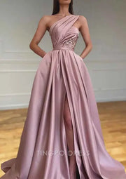 TingPo Wholesale Elegant A-line One-Shoulder Sleeveless Sweep Train Satin Prom Dresses With Split Pleated