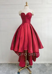 This red high - low gown is a lovely blend of elegance and whimsy. The strapless, sweetheart neckline creates a classic and feminine silhouette, while the voluminous skirt with a high - low hem adds a playful, modern touch. Crafted from smooth, lustrous satin, it drapes beautifully, making it perfect for proms, parties, or special occasions. The vibrant red hue exudes energy and charm, ensuring you stand out with timeless grace. Pair it with delicate accessories to complete the look and embrace a style that’s both enchanting and sophisticated.