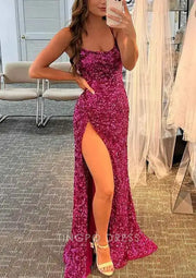 TingPo Wholesale Elegant Sheath/Column Bateau Spaghetti Straps Long/Floor-Length Velvet Sequins Prom Dress With Split