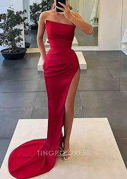 TingPo Wholesale Elegant Sheath/Column Off-the-Shoulder Sleeveless Court Train Satin Prom Dress With Pleated