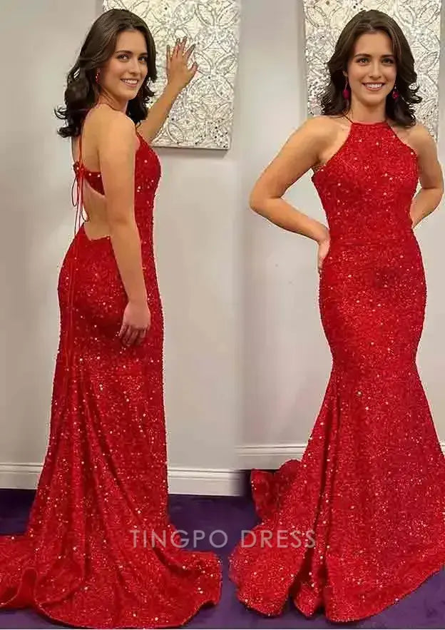 TingPo Wholesale Elegant Trumpet/Mermaid Halter Sleeveless Sweep Train Velvet Sequins Prom Dress
