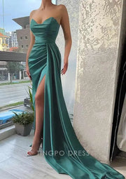 TingPo Wholesale Elegant Trumpet/Mermaid Sweetheart Strapless Court Train Satin Prom Dress With Pleated Split