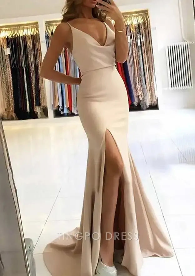 TingPo Wholesale Elegant Trumpet/Mermaid V Neck Sleeveless Sweep Train Satin Prom Dress