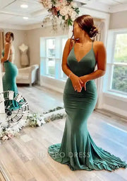 TingPo Wholesale Elegant Trumpet/Mermaid V Neck Spaghetti Straps Court Train Jersey Prom Dress With Pleated