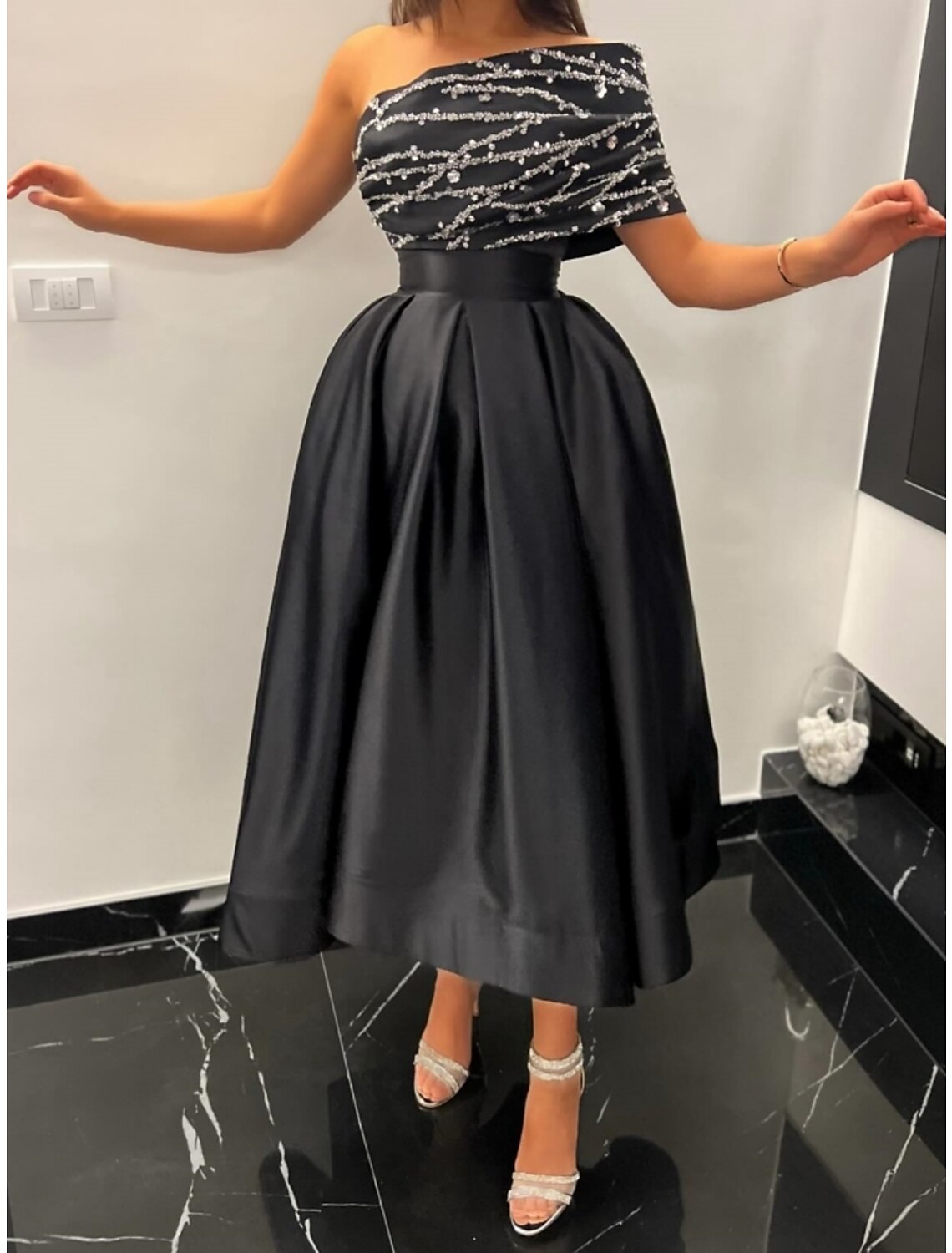 Wholesale A-Line Evening Gown Elegant Dress Formal Ankle Length Black Dress Short Sleeve One Shoulder Satin with Pleats Sequin - US 2 / UK 6 / EU 32