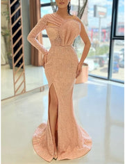 Wholesale A-Line Evening Gown Elegant Dress Formal Sweep / Brush Train Long Sleeve One Shoulder Sequined with Glitter Pleats Ruched - US 2 / UK 6 / EU 32