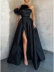Wholesale A-Line Evening Gown High Split Dress Formal Floor Length Sleeveless One Shoulder Satin with Feather Slit - Black / US 2 / UK 6 / EU 32