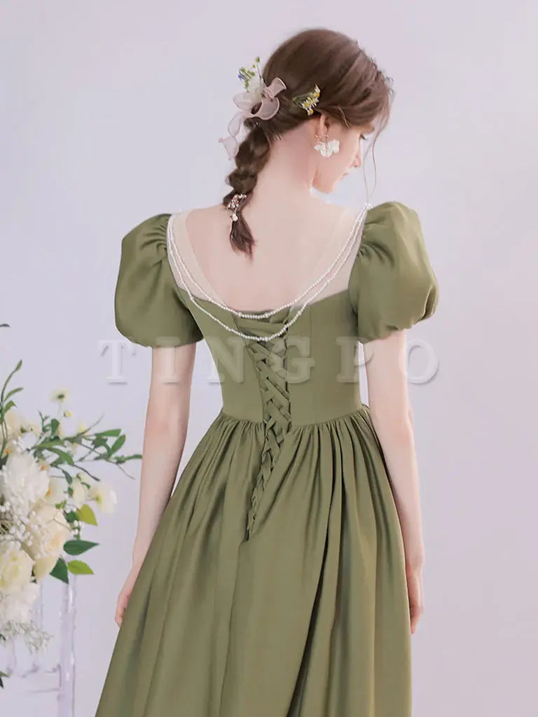 Wholesale A-Line Green Satin Tea Length Prom Dress Green Long Formal Dress gowns evening dresses - US 2 / UK 6 / EU 32