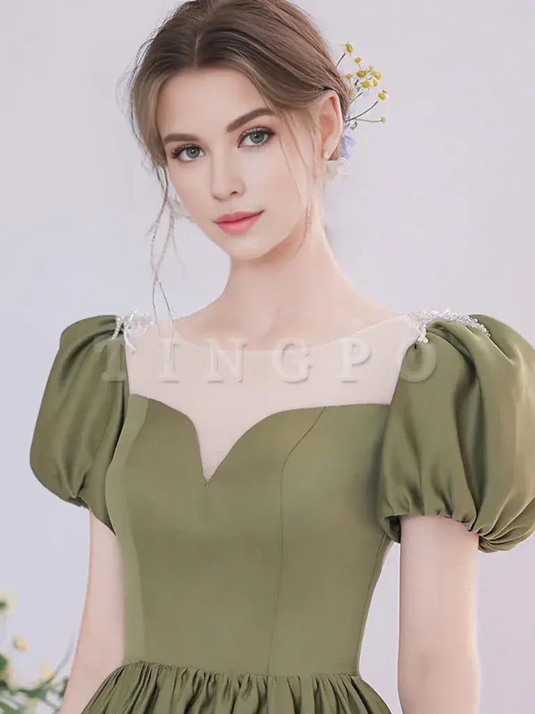 Wholesale A-Line Green Satin Tea Length Prom Dress Green Long Formal Dress gowns evening dresses