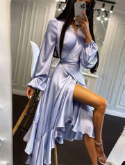 Wholesale A-Line Wedding Guest Dresses High Low Dress Party Wear Semi Formal Asymmetrical Long Sleeve V Neck Satin with Ruffles - Sky Blue / US 2 / UK 6 / EU 32
