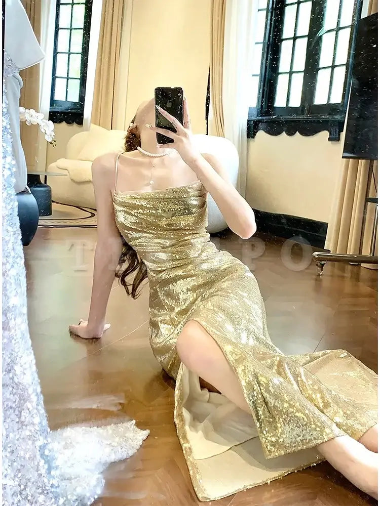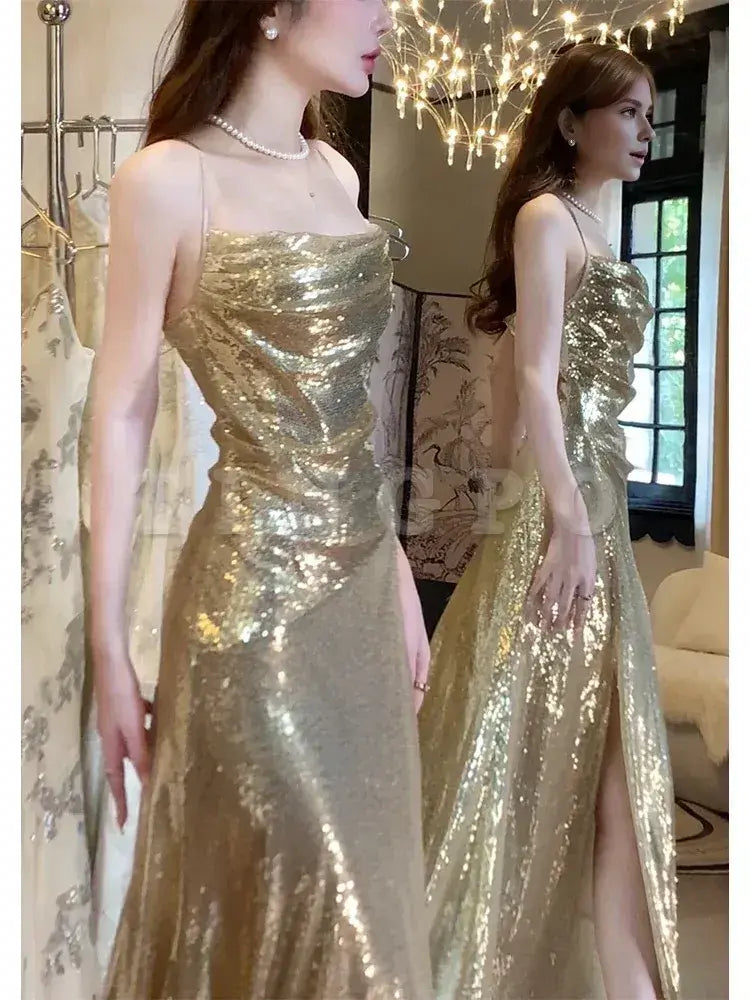 Wholesale Gorgeous Sheath Spaghetti Straps Gold Sequin Slit Prom Dresses Evening Dress gowns evening dresses - US 2 / UK 6 / EU 32
