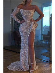 Wholesale Mermaid Dress Evening Gown Christmas Red Green Dress Formal Wedding Court Train Long Sleeve One Shoulder Sequined with Sequin Slit - Champagne / US 2 / UK 6 / EU 32