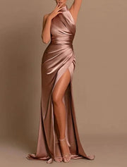Wholesale Mermaid Dress Evening Gown High Split Dress Halter Neck Christmas Red Green Dress Wedding Sweep / Brush Train Sleeveless Bridesmaid Dress Satin With Pleats - Dusty Rose / US 2 / UK 6 / EU 32