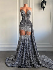 Wholesale Mermaid / Trumpet Evening Gown Sparkle & Shine Dress Carnival Formal Court Train Sleeveless Strapless African American Sequined with Beading Sequin - Silver / US 2 / UK 6 / EU 32