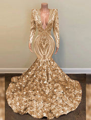 Wholesale Mermaid / Trumpet Sparkle Evening Dress Sexy Engagement Formal Floral Wedding Dress V Neck Long Sleeve Chapel Train Sequined African - Gold / US 2 / UK 6 / EU 32
