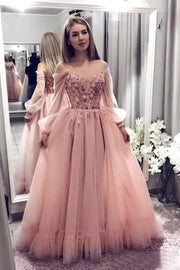 Wholesale Princess Ball Gown Blush Pink Lace Off the Shoulder Prom Dresses With Long Sleeves