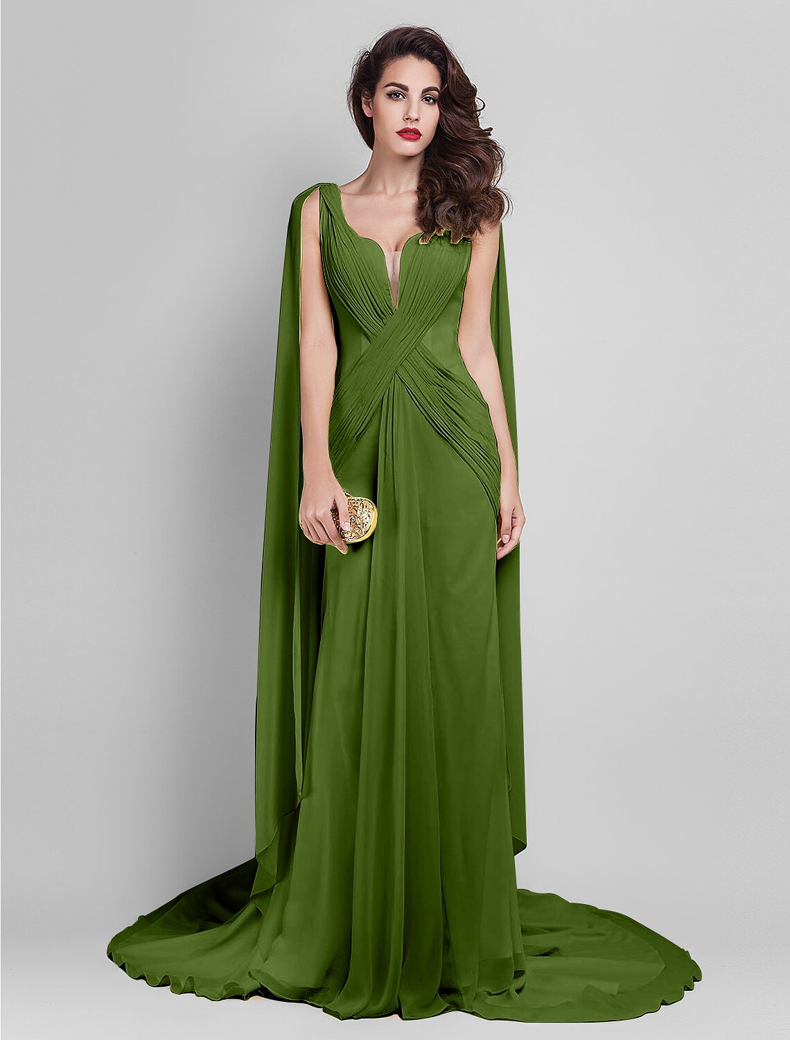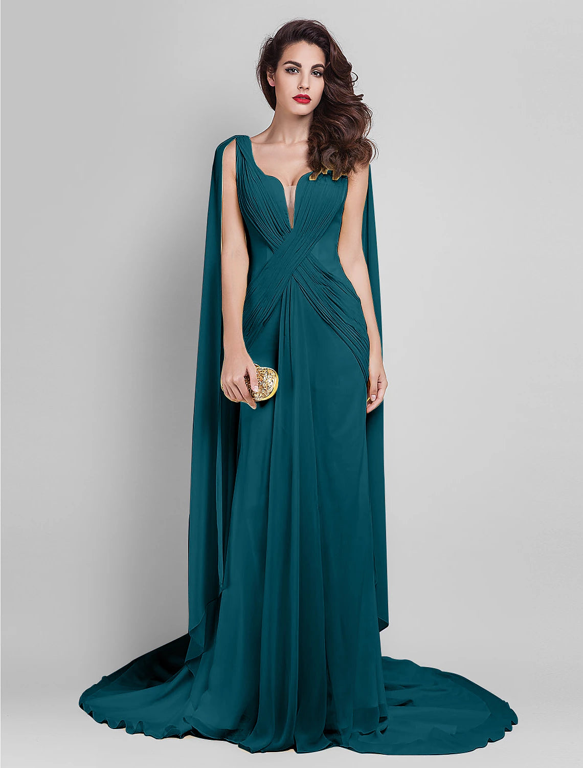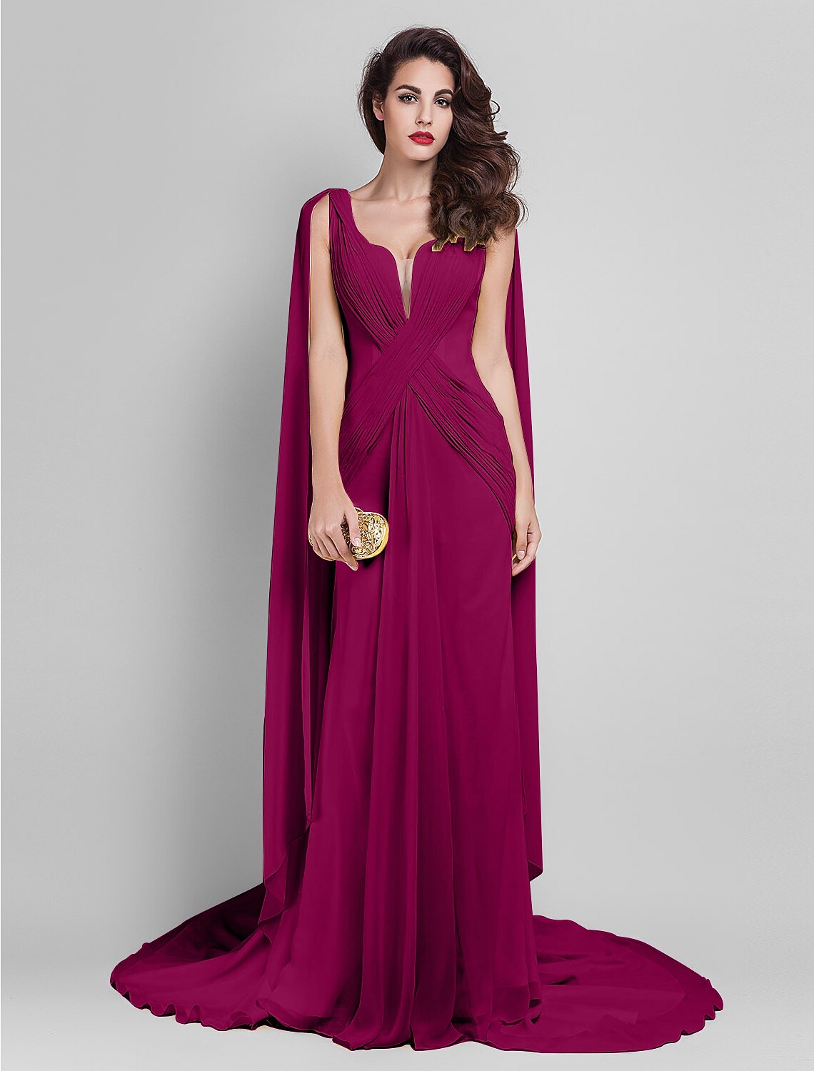 Wholesale Sheath / Column Elegant Dress Wedding Guest Prom Court Train Sleeveless Plunging Neck Georgette V Back with Criss Cross Side Draping