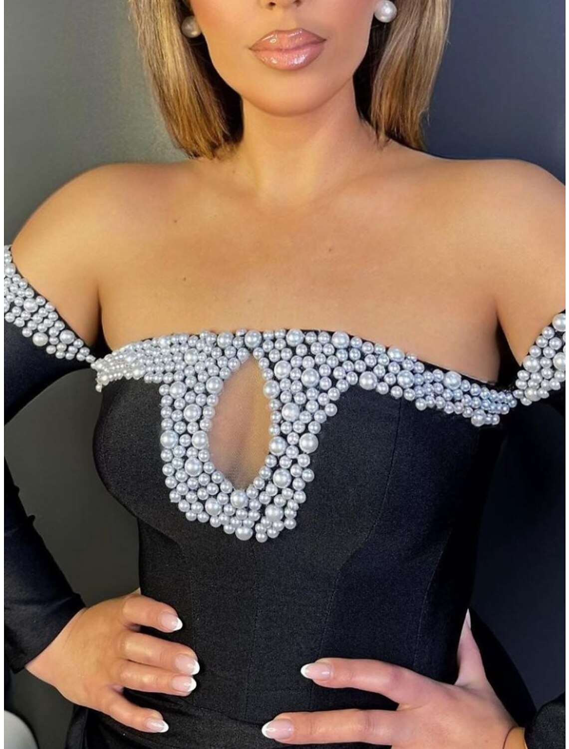 Wholesale Sheath / Column Evening Gown Elegant Dress Formal Sweep / Brush Train Black Dress Long Sleeve Off Shoulder Satin with Pleats Ruched Beading - US 2 / UK 6 / EU 32