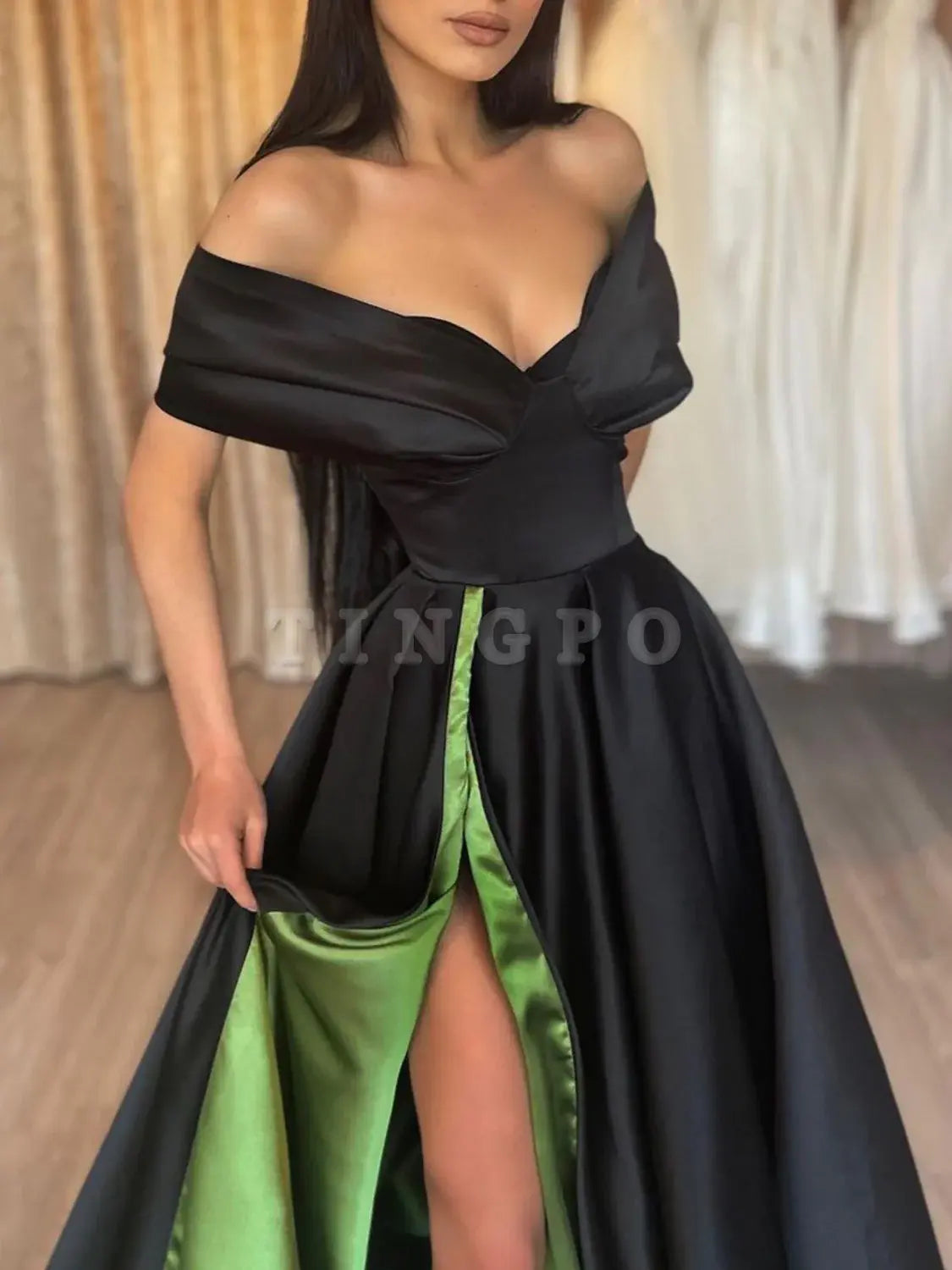 Wholesale Simple black satin off shoulder long prom dress black evening dress gowns evening dresses