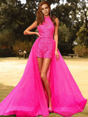 Wholesale Sparkle Sequins Prom Dress 2022 Convertible Formal Evening Dresses For Birthday Party Romper Shorts With Puffy Detachable Overskirts Sweep Brush Train Tulle