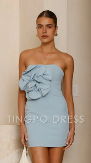 TingPo Wholesale Elegant Baby Blue Strapless Mini Dress with Oversized Floral Embellishment